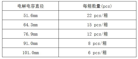 根据电解电容直径的不同,CECTN电容每箱包装数量分为下表中六种:
