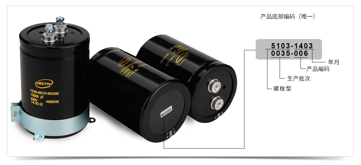 ? ? ? ? CECTN电解电容厂家所生产的么每一只螺栓型电解电容器都会赋予一个唯一的编码,此编码可用于追溯数据,在螺栓型电解电容出厂后任可查询该产品的所有生产记录以及测试数据等信息。