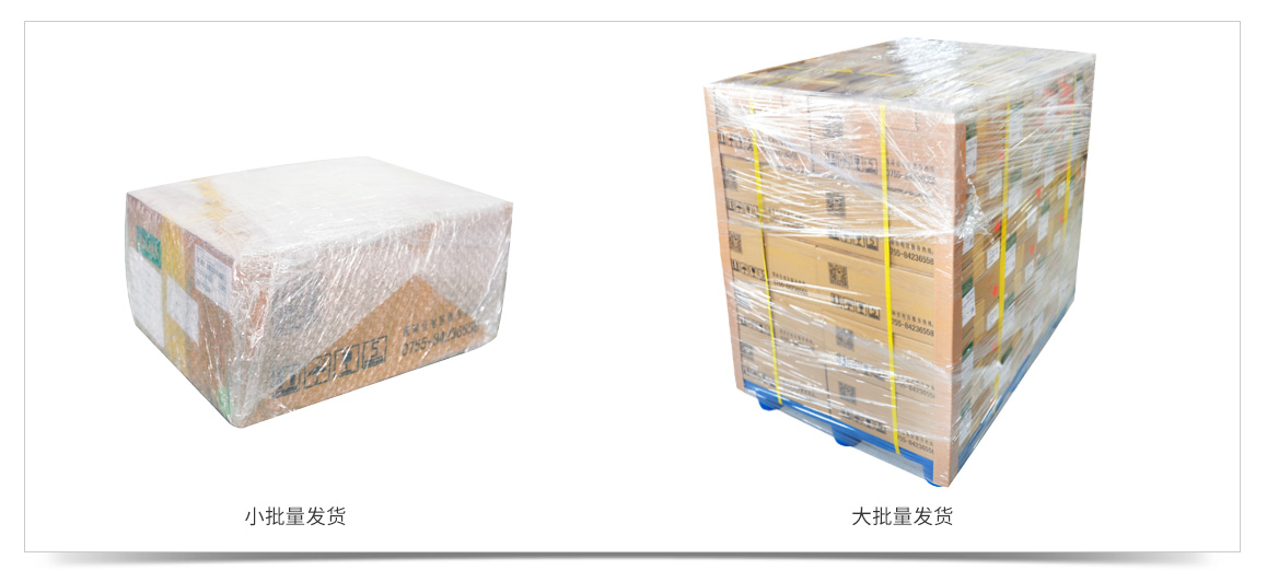 CECTN电解电容小批量发货时,直接采用缠绕膜缠绕,大批量发货时采用卡板堆垛,并用打包带进行固定,最后外层缠上缠绕膜。(见上图)