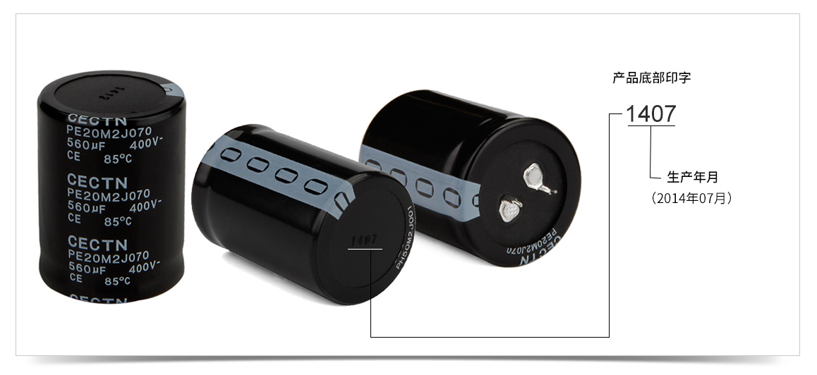 牛角型电解电容底部印字信息为4位数组成,代表着该产品的生产年月,上图所示的1412即表示该产品为2014年12月所生产。