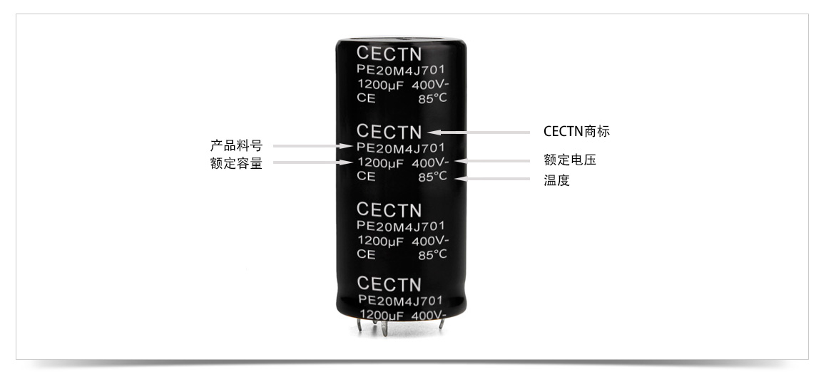 CECTN电解电容印字信息中包含了牛角型电解电容的电压、容量、温度、寿命、焊针数量型号等众多信息,详细了解请点击进入《牛角型电解电容料号说明》页面。