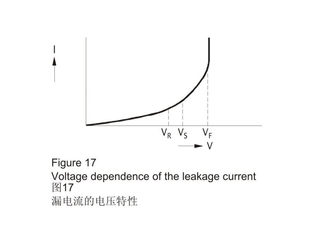 如图15所示,在电压加载至铝电解电容器的前几分钟内,有一股很强的漏电流流过,特别是在长时间储存期间未施加过电压的情况下。在连续工作期间,漏电流会减小,直至几乎恒定的“稳态”值。
