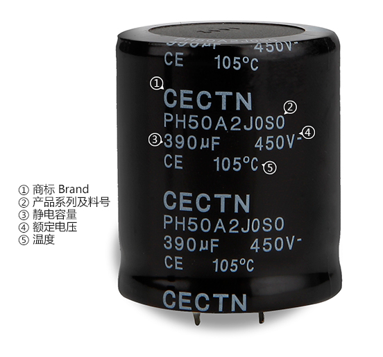 CECTN品牌牛角电解电容料号有16位数字组成,料号中包含牛角电容器的电压、容量、温度、寿命、直径、焊针结构、容量组别等信息等。? 图例牛角电容器: